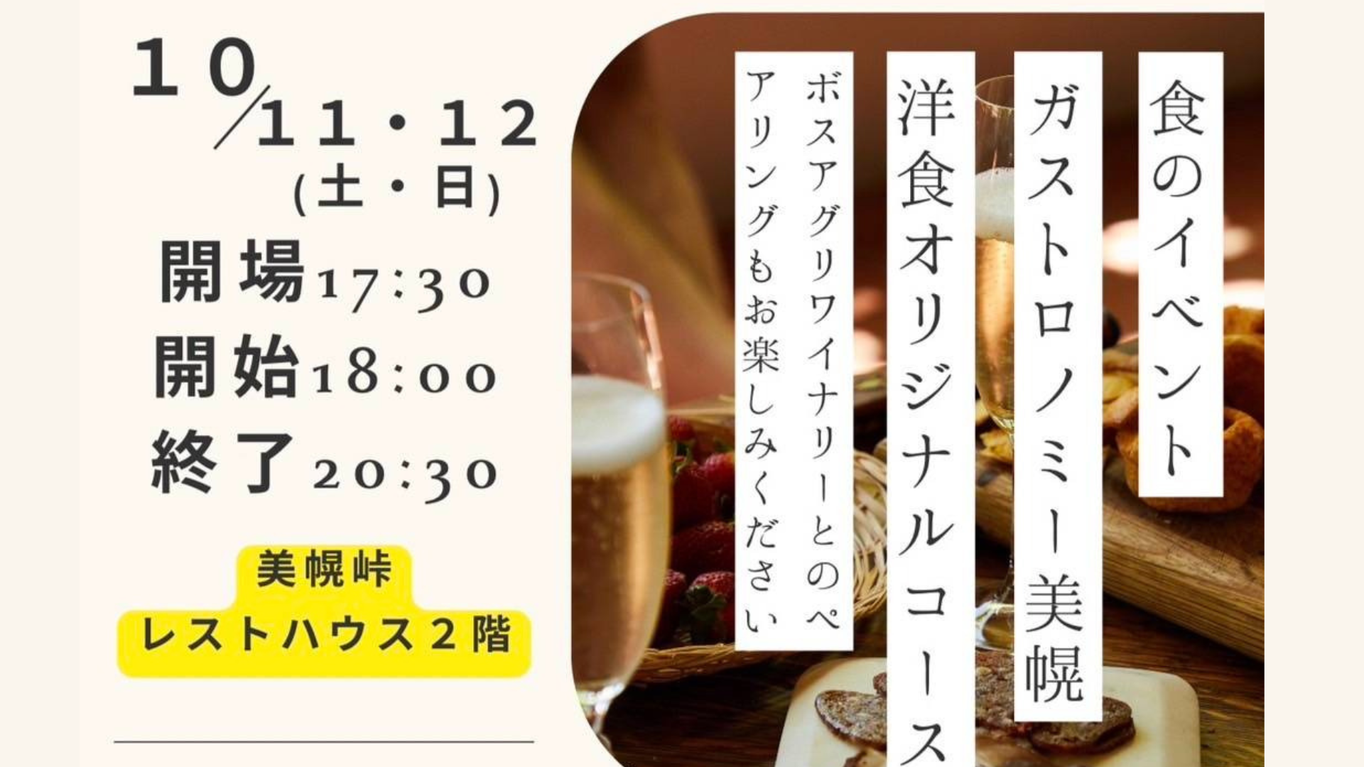 地域の豊かな食文化を発信し、地域の活性化に貢献することを目的として、美幌町産の食材を活用したコース料理と厳選したワインを共に楽しんでいただくイベントです。